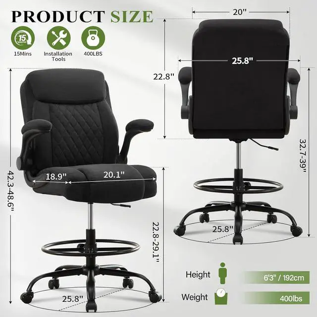 Built to withstand daily use, this tall drafting chair features a robust frame and durable fabric. The smooth-rolling casters offer easy mobility, while the reliable base ensures stability. This tall office chair for standing desk is a perfect fit for any workspace, whether home or office.