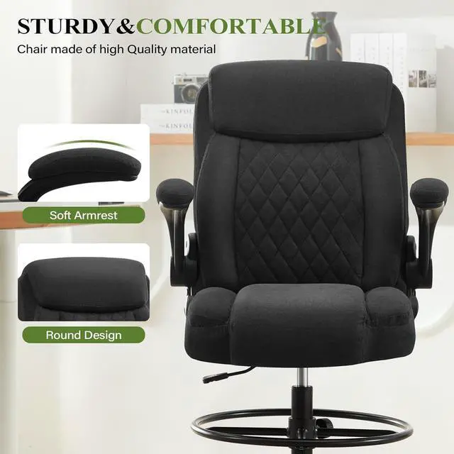 Drafting Chair Tall Office Chair for Standing Desk, Ergonomic Tall Desk Chair with Adjustable Foot Ring, Flip-Up Armrests, Lumbar Support, Comfortable Fabric Seat Ideal for Home and Office Use