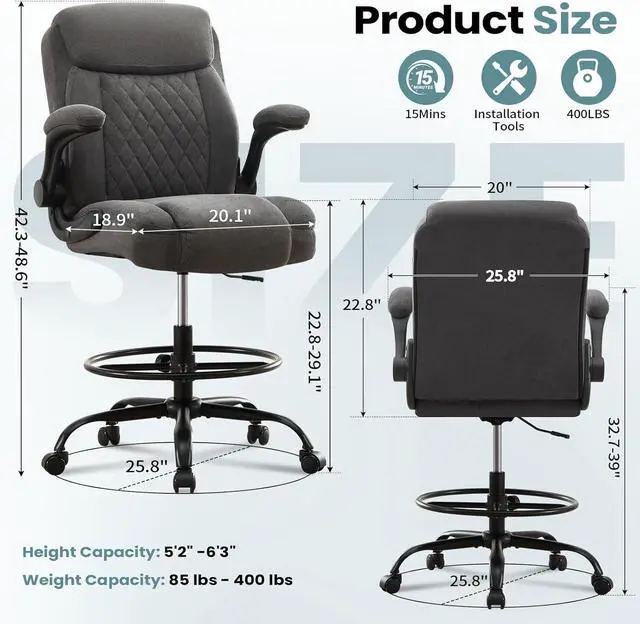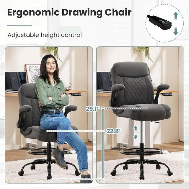 This drafting chair features a smooth pneumatic lift that allows you to easily adjust the height from 22.8 to 29.1 inches, perfectly matching standing desks, counter-height tables, or drafting tables. Whether youre working at home, in the studio, or at the office, this tall office chair gives you seamless movement between sitting and standing positions, reducing fatigue and improving posture throughout your day.