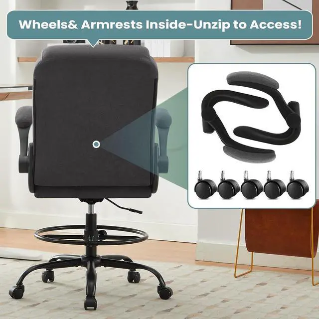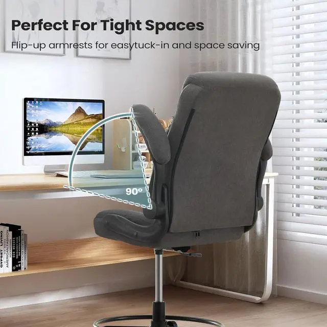 - & Designed with flip-up armrests, this counter height office chair adapts to your workspace needs. Easily slide it under tall desks to save space or flip the arms up to move freely when sketching, typing, or collaborating. Perfect for home offices, studios, or shared work environments where flexibility and efficient use of space are essential.