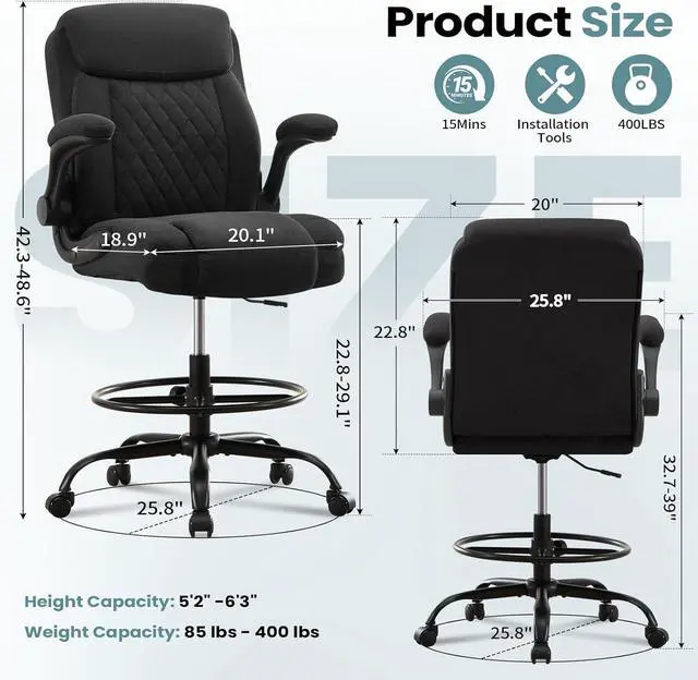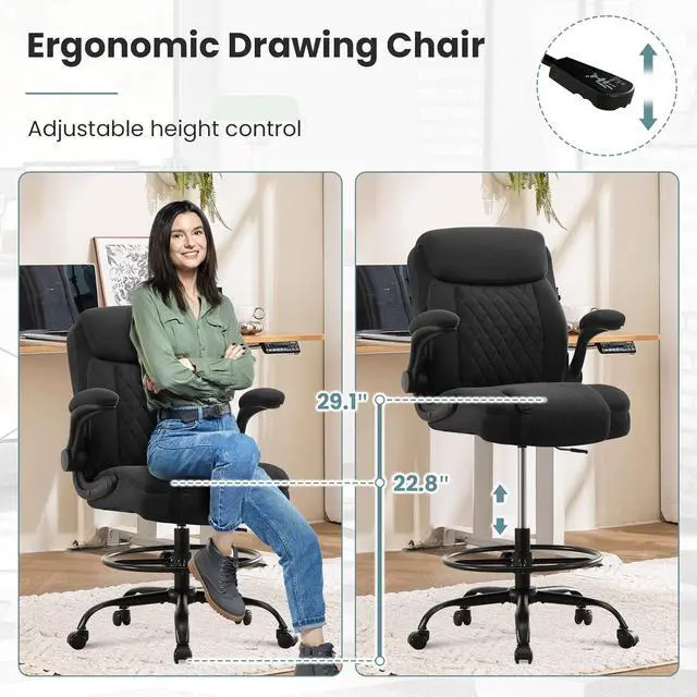 This drafting chair features a smooth pneumatic lift that allows you to easily adjust the height from 22.8 to 29.1 inches, perfectly matching standing desks, counter-height tables, or drafting tables. Whether youre working at home, in the studio, or at the office, this tall office chair gives you seamless movement between sitting and standing positions, reducing fatigue and improving posture throughout your day.