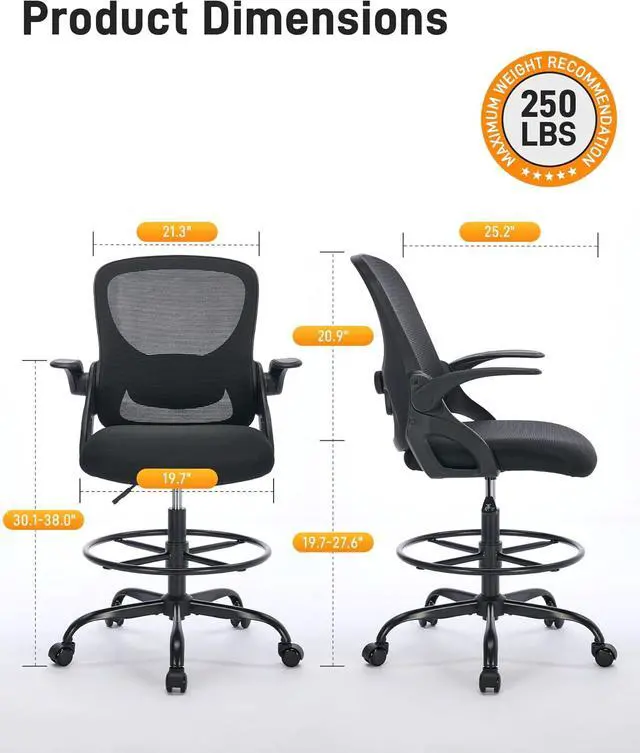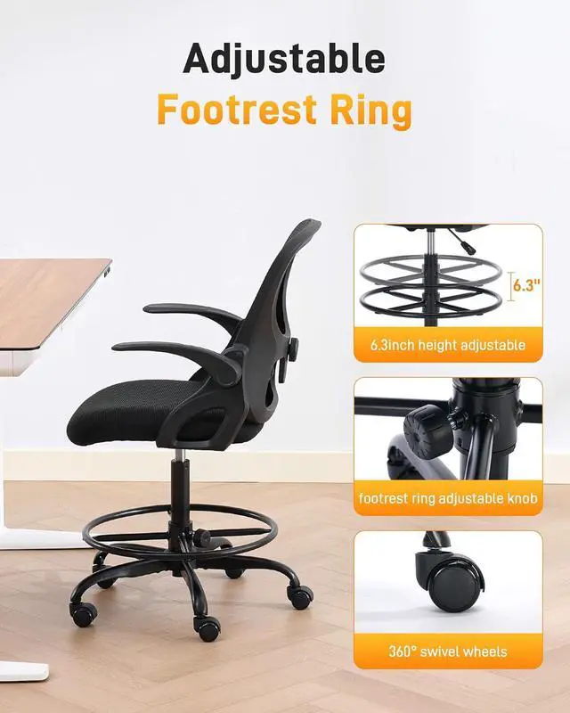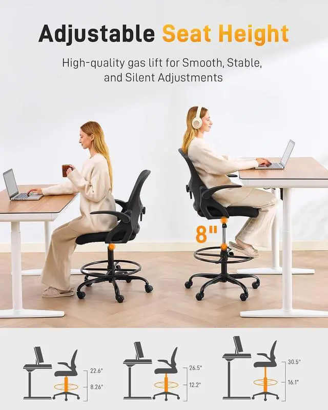 Versatile Height for Sit-Stand Desks Designed for flexibility, the seat height adjusts from 19.7" to 27.6", making it the ideal companion for standing desks, tall craft tables, or lab counters. The 17.7" adjustable foot ring allows you to find the perfect leg position to reduce fatigue.