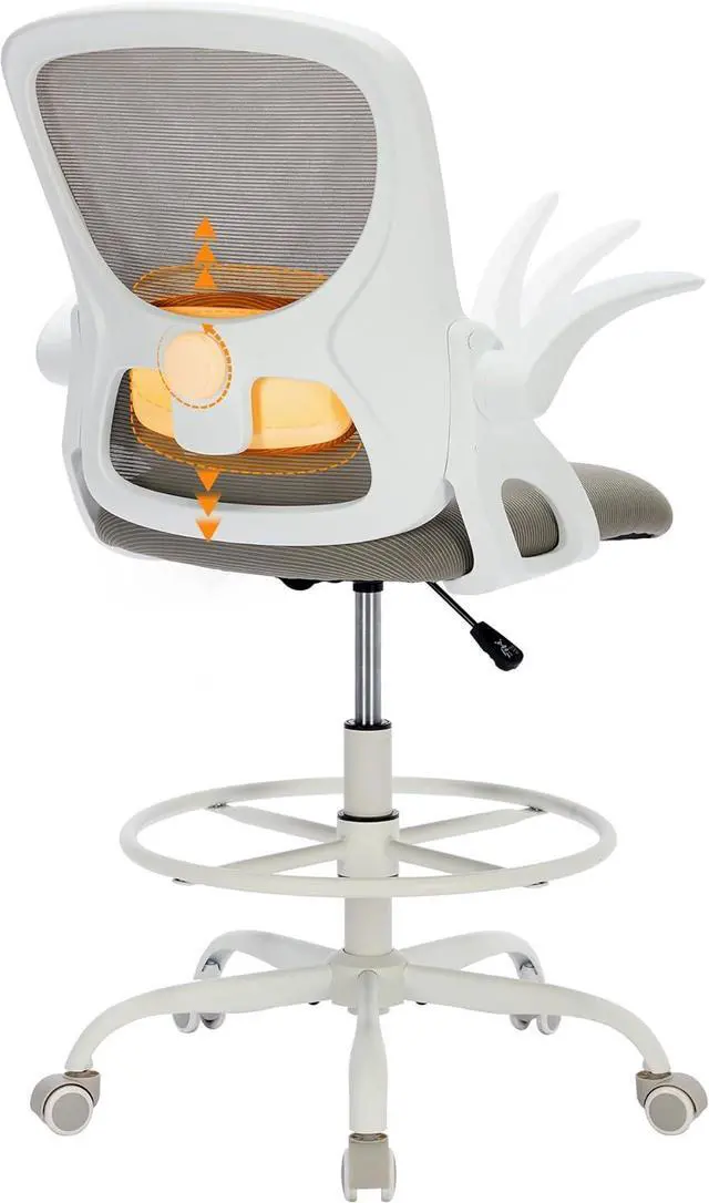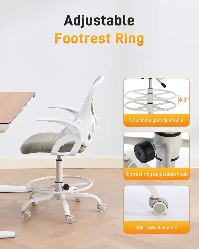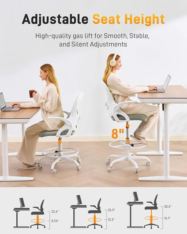 Versatile Height for Sit-Stand Desks Designed for flexibility, the seat height adjusts from 19.7" to 27.6", making it the ideal companion for standing desks, tall craft tables, or lab counters. The 17.7" adjustable foot ring allows you to find the perfect leg position to reduce fatigue.