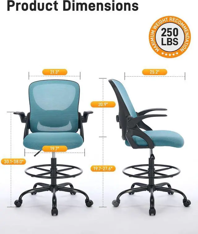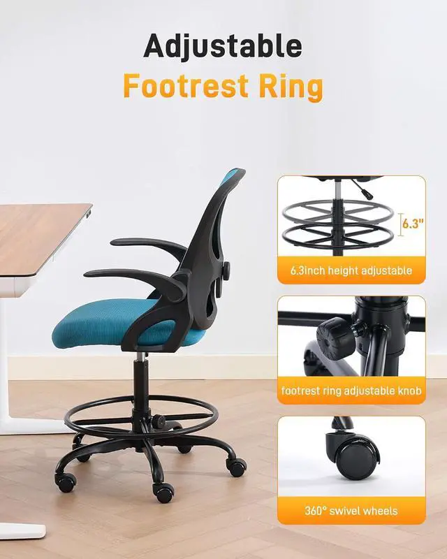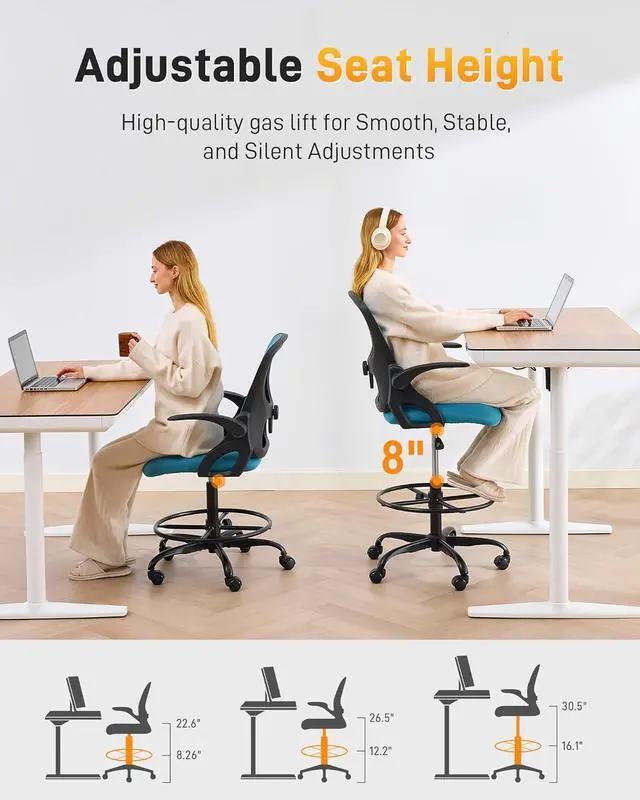 Versatile Height for Sit-Stand Desks Designed for flexibility, the seat height adjusts from 19.7" to 27.6", making it the ideal companion for standing desks, tall craft tables, or lab counters. The 17.7" adjustable foot ring allows you to find the perfect leg position to reduce fatigue.