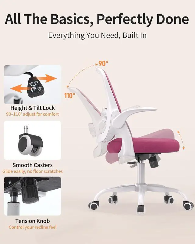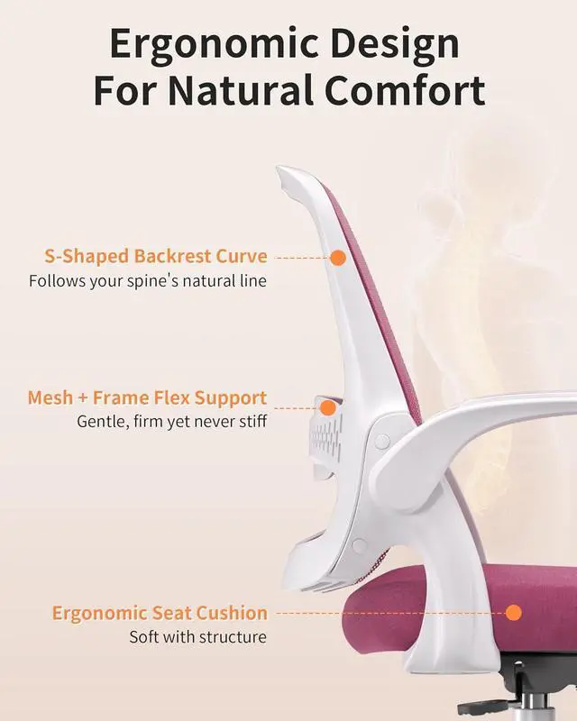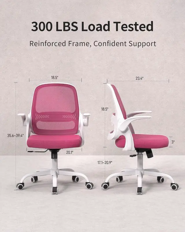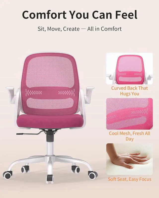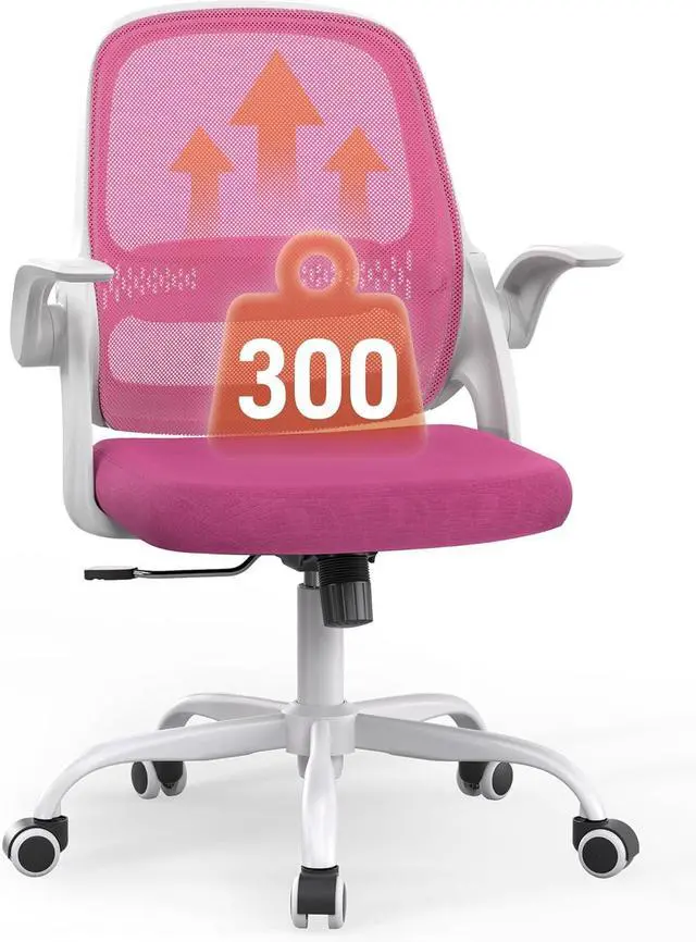 Ergonomic Mesh Office Chair with Flip-Up Arms, Adjustable Height, Breathable Mesh Back & Thick Cushion Seat, 360° Swivel Rolling Computer Desk Chair, BIFMA Certified, Supports 300 lbs (Pink)