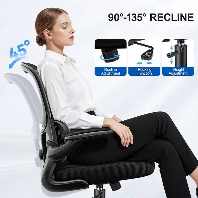90° Flip-Up Armrests for Space SavingSoft padded armrests reduce pressure on elbows and forearms. The 90° flip-up design lets you tuck this office desk chair under the table easily for space saving. Ideal for home, office, meeting rooms and other work settings