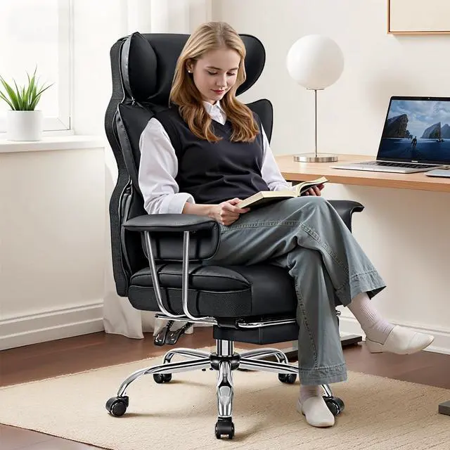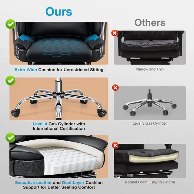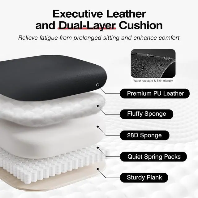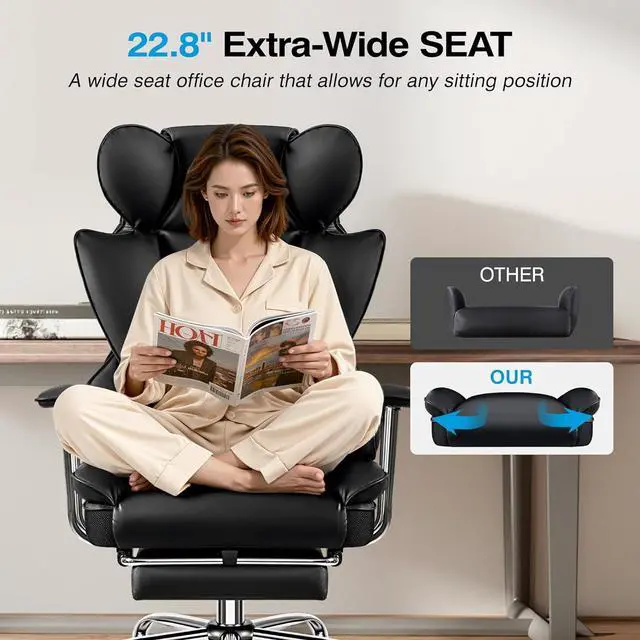 Extra-Wide Seat & Dual-Layer Cushion Cramped chairs causing numb legs or hip pressure? This ergonomic office chair features an extra-wide, overstuffed seat with executive leather and a dual-layer cushion for pressure-free support. The no-side-wing design fits big and tall office chair users comfortably. This office chair with a retractable footrest relieves leg fatigue during breaks.