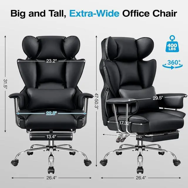 Office Chair Comfy, Big and Tall Executive Leather Chair, High Back Ergonomic Wide Chair with Footrest, Reclining Computer Desk Chair, Heavy Duty Gaming Chair with Padded Arm and Pillow, Black