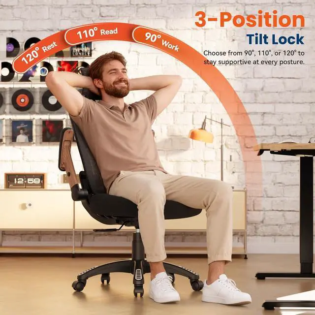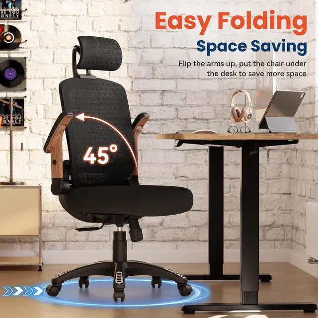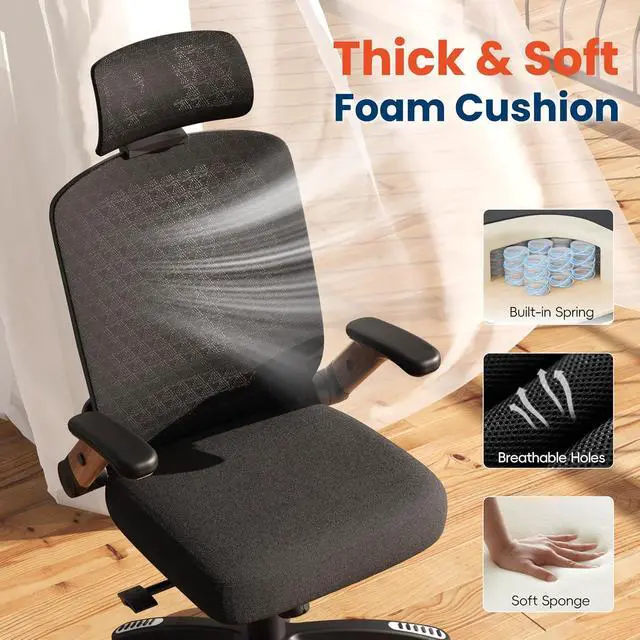 GABRYLLY Ergonomic Office Chair, High Back Home Desk Chair with Flip-Up Arms, 3D Headrest, Thick Sponge Sea &90-120° Recline, Big and Tall Mesh Executive Chairs for Man Woman, Black Woodgrain