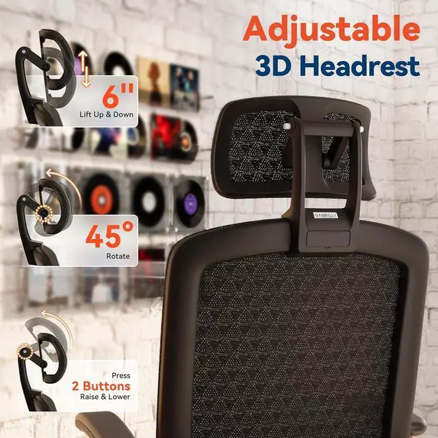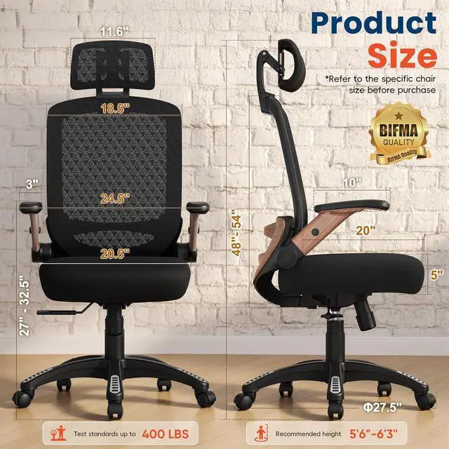 ERGONOMIC OFFICE CHAIR- The ergonomic chair provides 4 supporting points(head/ back/ hips/ hands) and a proper lumbar support. Suitable for people of about 5'5" to 6'2"(Please refer to the height of the user). It's easy to adjust seat height, headrest, backrest and flip-up arms to meet different needs, good for sitting long hours.