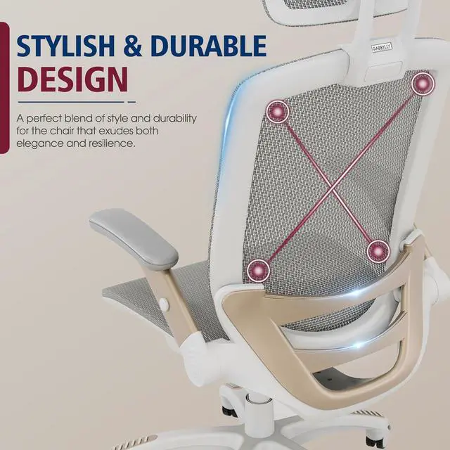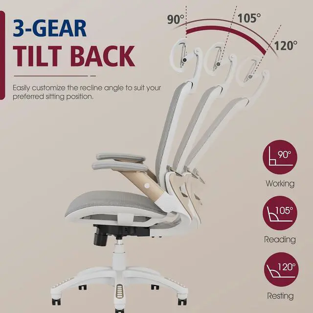 GABRYLLY Ergonomic Office Chair, High Back Home Desk Chair with Headrest, Flip-Up Arms, 90-120° Tilt Lock and Wide Cushion, Big and Tall Mesh Chairs for Man Woman, White Task Chair