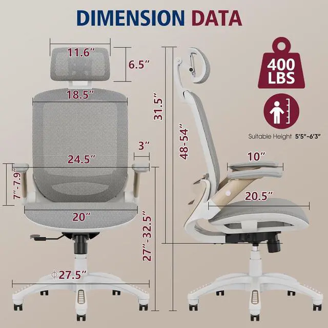 ERGONOMIC OFFICE CHAIR- The ergonomic chair provides 4 supporting points(head/ back/ hips/ hands) and a proper lumbar support. Suitable for people of about 5'5" to 6'2"(Please refer to the height of the user). It's easy to adjust seat height, headrest, backrest and flip-up arms to meet different needs, good for sitting long hours.