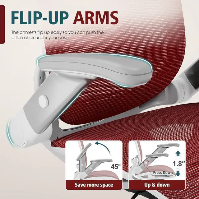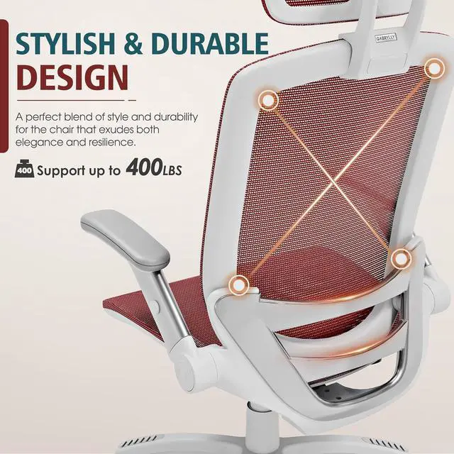 GABRYLLY Ergonomic Office Chair, High Back Home Desk Chair with Headrest, Flip-Up Arms, 90-120° Tilt Lock and Wide Cushion, 400LBS Mesh Chairs for Man Woman, White Task Chair(Red,GY01WR)
