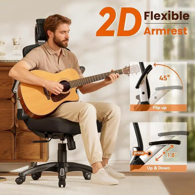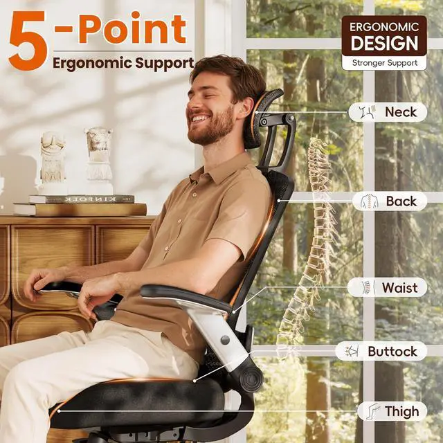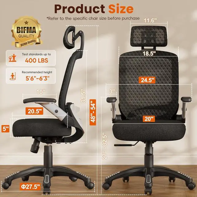 ERGONOMIC OFFICE CHAIR- The ergonomic chair provides 4 supporting points(head/ back/ hips/ hands) and a proper lumbar support. Suitable for people of about 5'5" to 6'2"(Please refer to the height of the user). It's easy to adjust seat height, headrest, backrest and flip-up arms to meet different needs, good for sitting long hours.
