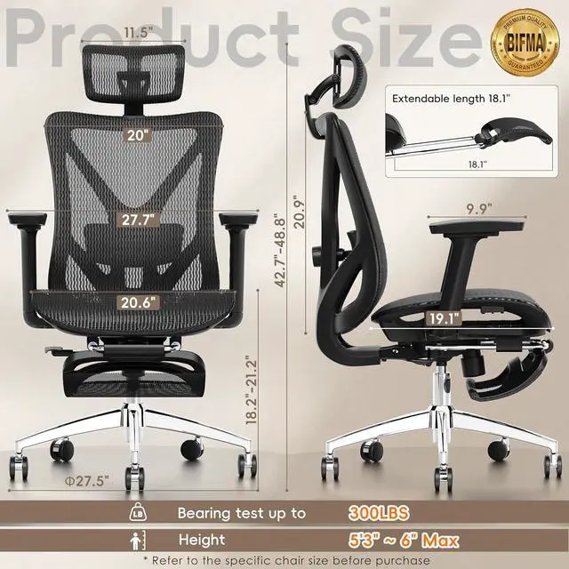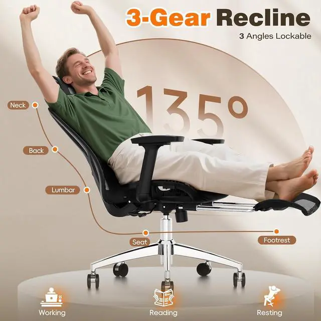 Recline & Work in ComfortThe 135° reclining chair offers 3 adjustable positions (90°/110°/135°), allowing you to lock the chair at your preferred angle for a comfortable lounge experience during breaks or naps. Seamless transition from work to rest. With dimensions of 20.6x19.1x42.7~48.8in(WDH), the office desk chair is designed for users between 5'3" and 6' tall, ensuring a perfect fit for your workspace.