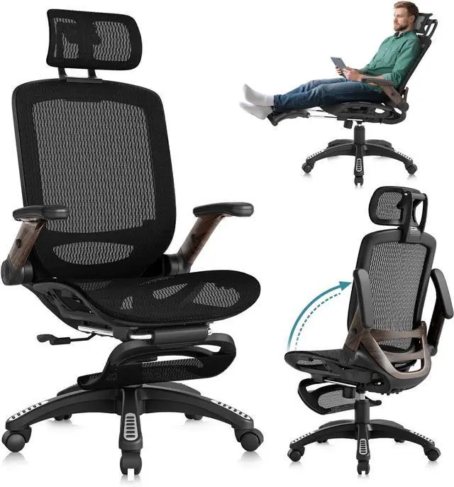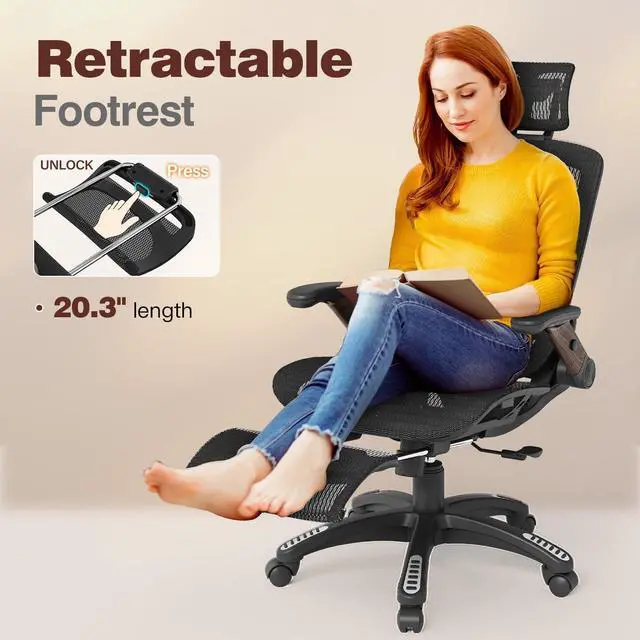 GABRYLLY Ergonomic Office Chair with Footrest, High Back Mesh Computer Chair with Flip-Up Arm, 3D Headrest, 135° Reclining, Rolling Gaming Task Chair with Wide Seat Lumbar Support,400LBS
