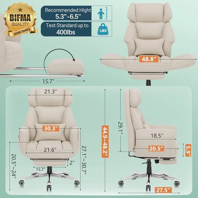 Over 4 Seating Modes, Lumbar Pillow Included - Supports up to 400LBS, fits user of 5'3''-6'5''. Transform your seating experience by adjusting the armrests and footrest to your desired position. Whether you're relaxing cross-legged, stretching out with the footrest, or using it as a traditional executive chair, this design adapts to your needs effortlessly.