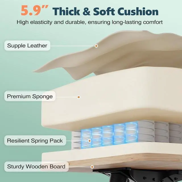 Wide & Thick Cushion - Crafted from skin-friendly and wear-resistant leather, GABRYLLY ergonomic office chair is designed with high-elasticity springs and filled with thick cotton to ensure both comfort and support. With a 5.9'' seat depth and 21.6'' width, the cushion is incredibly plush and generously sized. This combination provides a perfect balance of softness and firmness, reducing pressure on your hips and lower back, providing ultimate comfort for long hours. Soft PU leather seat is water-resistant and stain-proof, making it comfortable and easy to clean.