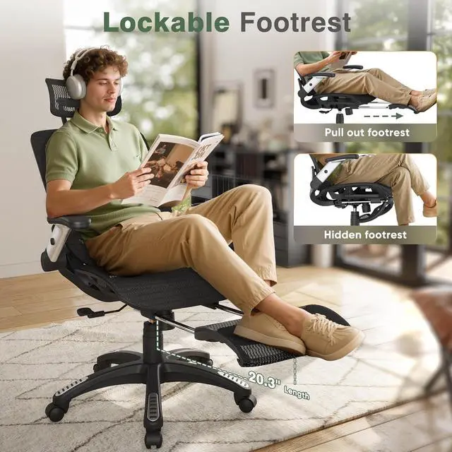 Extendable Footrest Work & Rest in One- Stretch out with the retractable 20.3" steel footrest, and lean back up to 135° for a quick recharge. Paired with the 3D headrest, it keeps you supported through calls, online classes, or downtime turning your chair into the nice spot to both work and relax.
