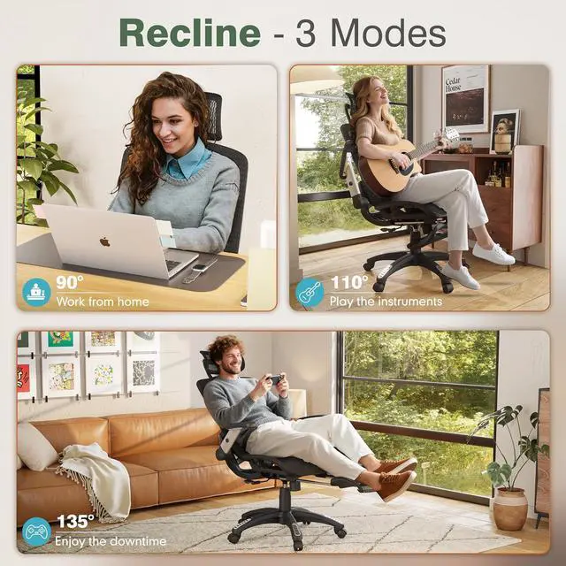 Tilt Back Up to 135° of Comfort- Transit smoothly from upright focus to laid-back comfort with a backrest that reclines to 90°, 110°, or 135°. From powering through tasks to casual lounging, or a refreshing power nap, the multi-angle tilt-lock keeps you supported at each angle.