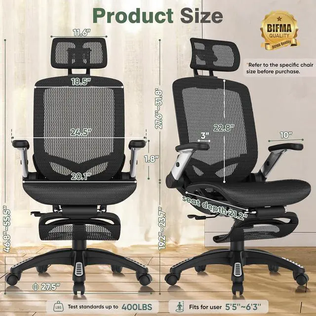 Ergonomic Mesh Chair- The ergonomic office chair delivers precision comfort, supporting 5 essential areas head, back, hips, legs, and arms. Designed for users 5'5" - 6'3" (please refer to actural height before purchasing). Offering fully adjustable features including seat height, recline, headrest, footrest, and flip-up armrests, along with proper lumbar support, it provides a tailored sitting sessions for extended hours.