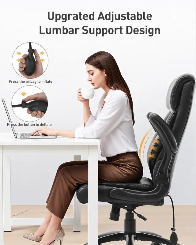 [Adjustable Air Lumbar Support] Say goodbye to slouching and back strain. Our office desk chair features built-in adjustable lumbar support with airbag inflation technology, allowing you to tailor spinal support to your body's needs. Simply press to adjust at any timeperfect for long hours at your desk. This dynamic system promotes healthy posture, reduces fatigue, and helps prevent long-term back issues.