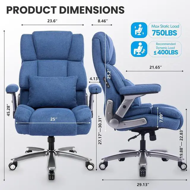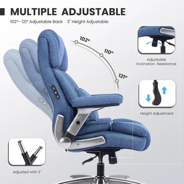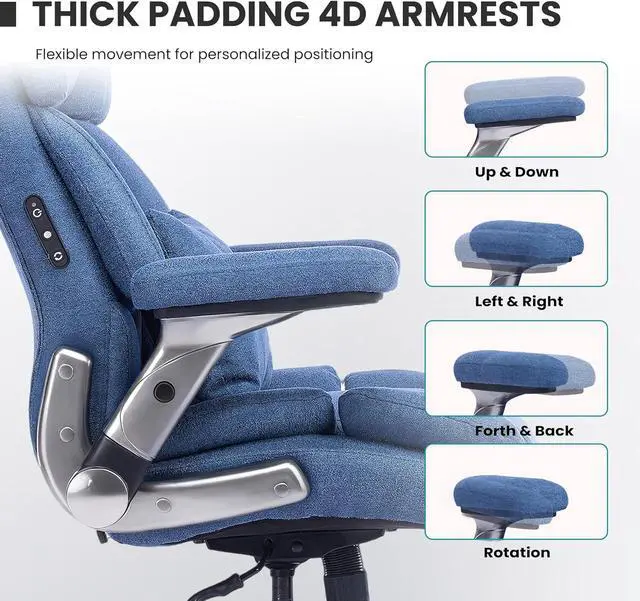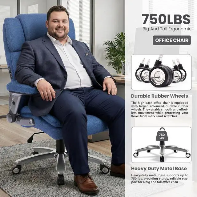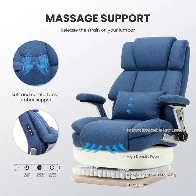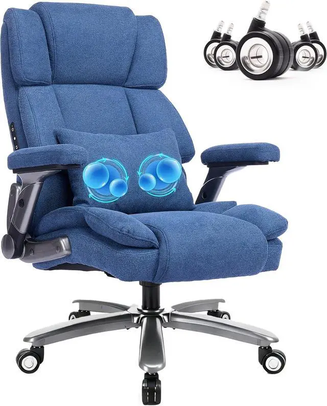 750lbs Heavy Duty Desk Chair with 3D Kneading Massage, Big and Tall Office Chairs with Ergonomic Support, 4D Armrests, 5 Quiet Dual Rubber Wheel, Thick Pocket Spring Cushion(Blue, Fabric)