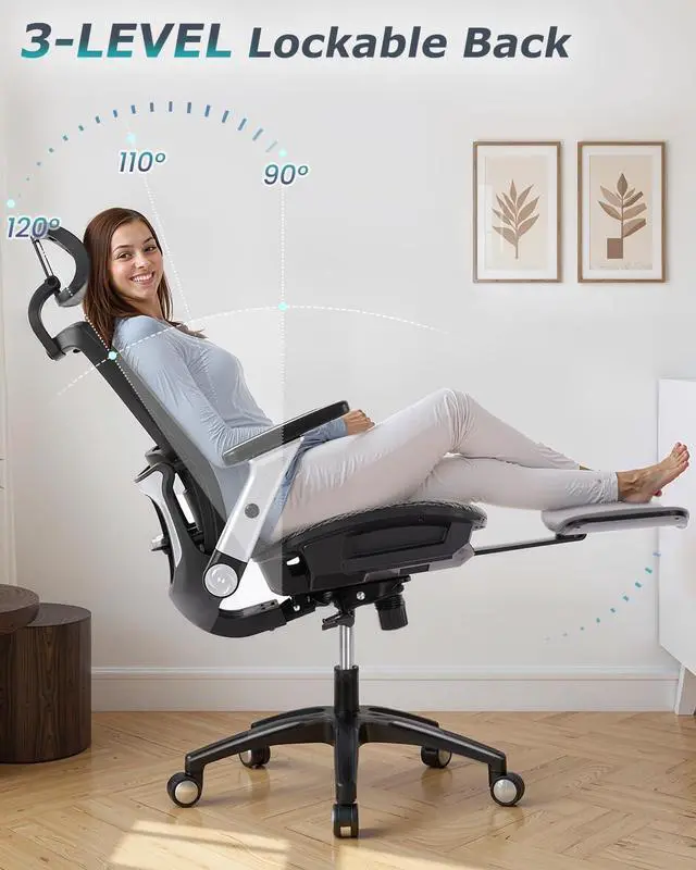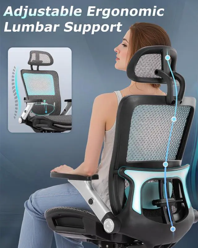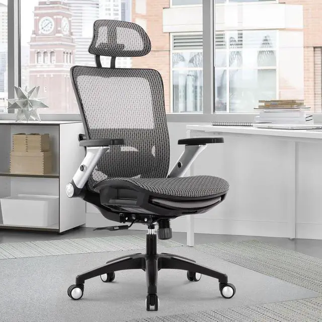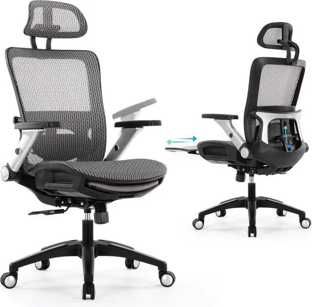 Ergonomic Office Chair with 4D Flip-up Arm, Mesh Chair with Adjustable Lumbar Support and Footrest,High Back Home Office Desk Chair,Computer Chair for Long Desk Work, Grey
