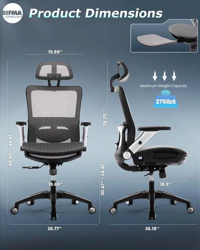 Outstanding Durability This BIFMA-certified chair is durable and can withstand an extreme impact pressure test of 275 pounds. Its sturdy frame is made of carefully crafted top-quality materials, and the durable mesh is resistant to wear and tear. High-density foam fillers maintain their shape over time, providing consistent comfort. Don't worry. This is a reliable companion for years of daily use.