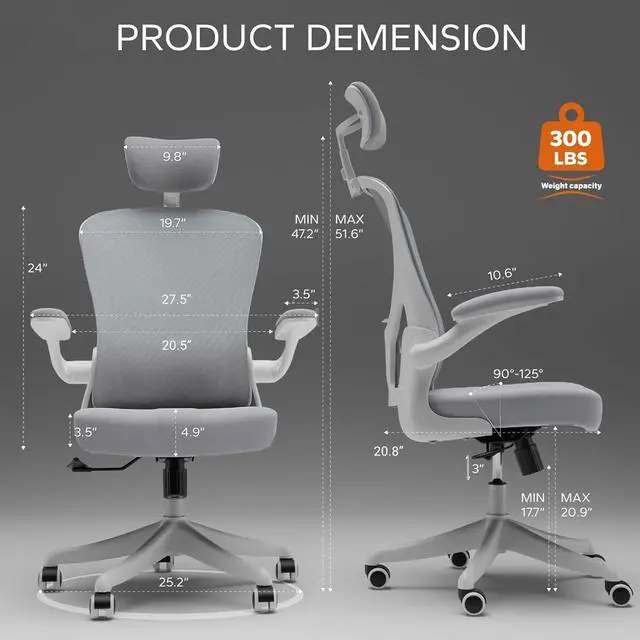 Ergonomic Office Chair with Adjustable Lumbar Support & Flip-Up Armrests - High Back Computer Desk Chair with Thickened Seat Cushion, Rolling Wheels for Home/Office Study Work 02h-grey-m