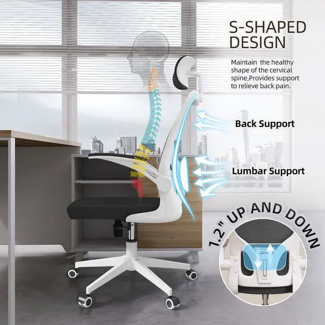 1. Ergonomic Office ChairDesigned for extended sitting, our ergonomic office chair delivers superior support for your back, hips, and arms, enhancing productivity with unmatched comfort. The adjustable lumbar support (1.2 vertical range) conforms to your spine, reducing strain, while customizable seat height, reclining backrest, and flip-up armrests let you find your perfect posture. Ideal for long hours of work or study, it helps alleviate back pain and promotes healthy spinal development in teens, ensuring ergonomic support for a fatigue-free experience.