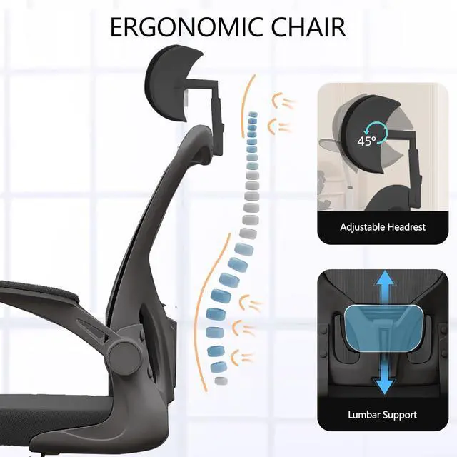 1. Ergonomic Office ChairDesigned for extended sitting, our ergonomic office chair delivers superior support for your back, hips, and arms, enhancing productivity with unmatched comfort. The adjustable lumbar support (1.2 vertical range) conforms to your spine, reducing strain, while customizable seat height, reclining backrest, and flip-up armrests let you find your perfect posture. Ideal for long hours of work or study, it helps alleviate back pain and promotes healthy spinal development in teens, ensuring ergonomic support for a fatigue-free experience.