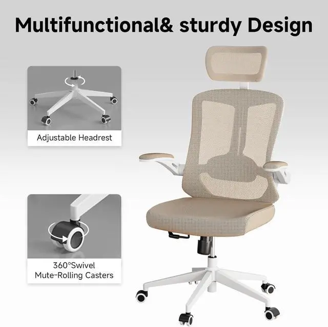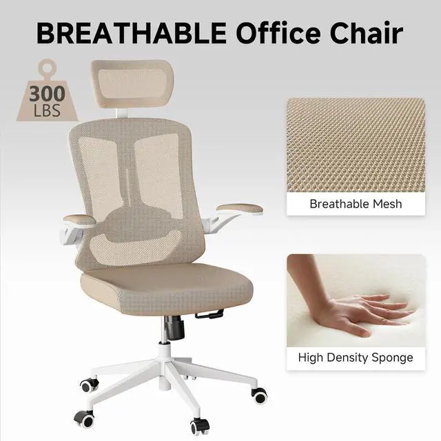 Ergonomic Office Chair with Adjustable Lumbar Support & Flip-Up Armrests - High Back Computer Desk Chair with Thickened Seat Cushion, Rolling Wheels for Home/Office Study Work (07khaki)
