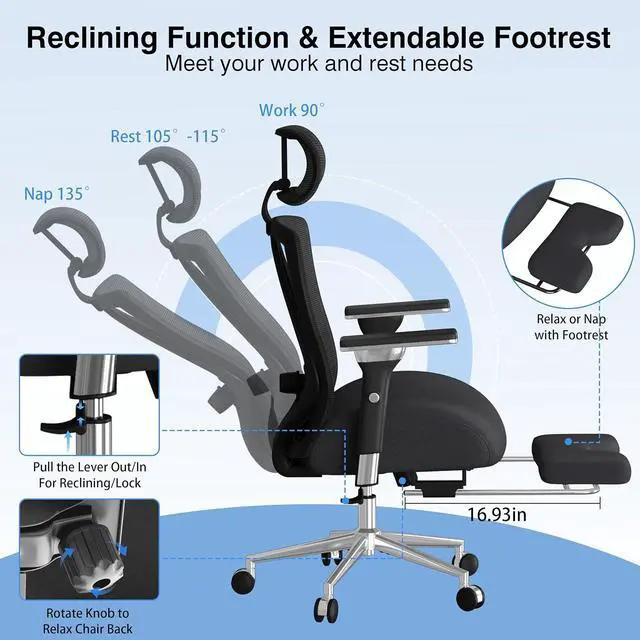 Ergonomic Comfort Office Chair: Experience unmatched comfort all day with our ergonomic office chair. It reclines up to 135° and features a 16.93-inch extended footrest with thick, padded foam, offering superior leg and foot support. Whether you're focused on work, enjoying a break, or taking a quick nap, this chair is designed to keep you comfortable and relaxed. The perfect balance of support and comfort ensures you stay energized and productive all day long.