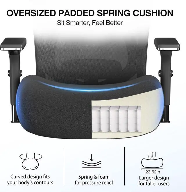 Oversized Padded Spring Cushion: For those who seek ultimate comfort during long office hours, our oversized padded spring cushion chair is designed for you! This big and tall office chair features a combination of high-density foam and a spring pack, providing unmatched support and a luxurious seating experience. With an extra-spacious cushion 19.69"D X 23.63W, this comfy chair is the perfect solution for people who need maximum comfort throughout the day.