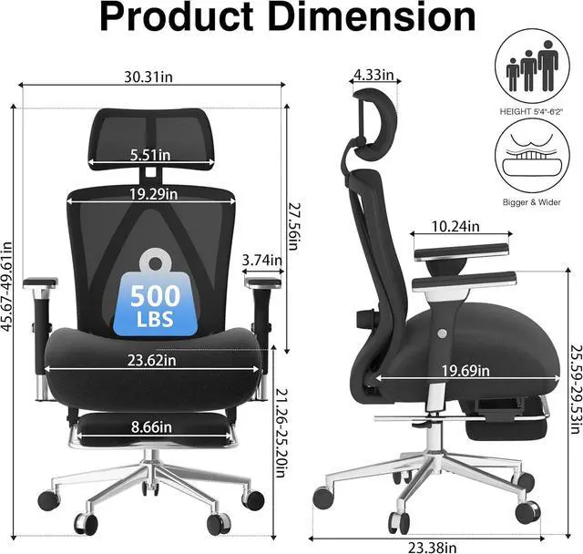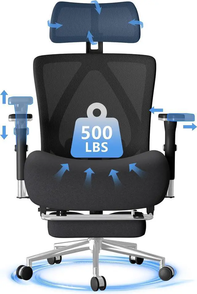 500 LBS Big and Tall Office Chair with Footrest, Ergonomic Mesh Office Chair with Thicken Wide Cushion, 4D Armrest, Adjustable Lumbar Support & Headrest, High Back Computer Desk Chair for Home, Black