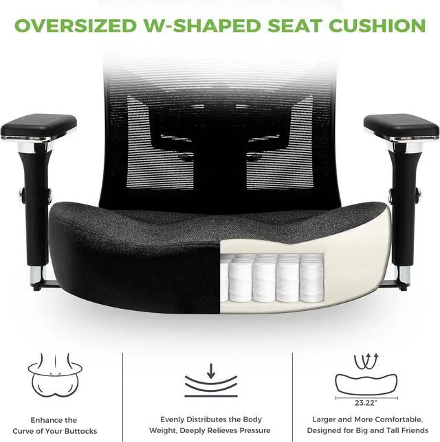 [ - ] Larger and more comfortable Designed for big and tall friends, it can hold up to 700 pounds. Featuring an oversized W-shaped seat cushion (5.1 Inches Thicker), it helps lift and contour the buttocks, evenly distributes body weight, deeply releases pressure. If you're in a heartbeat, click add to cart now and you will have the perfect sturdy chair designed just for you!