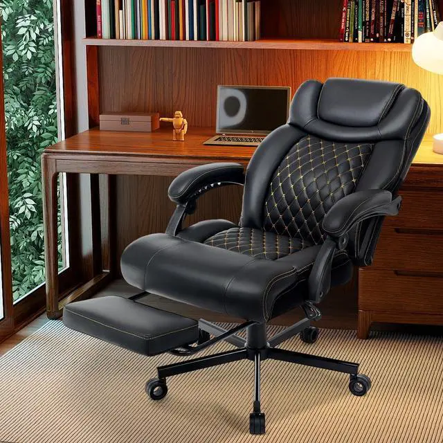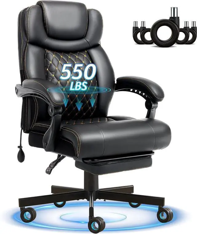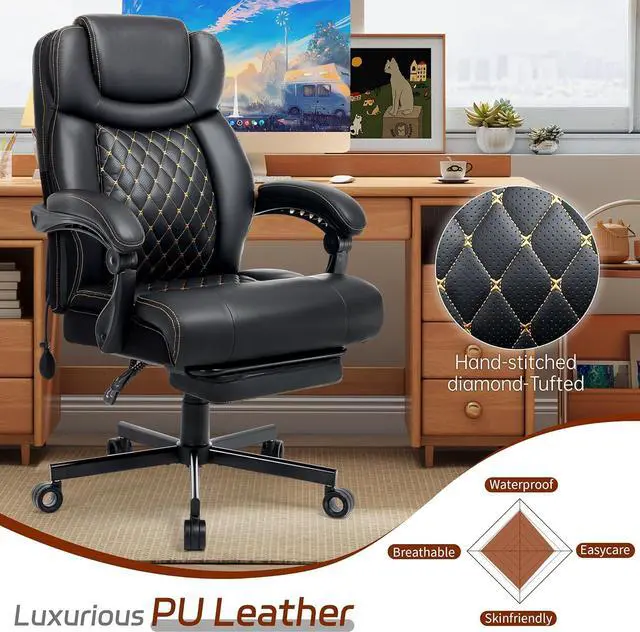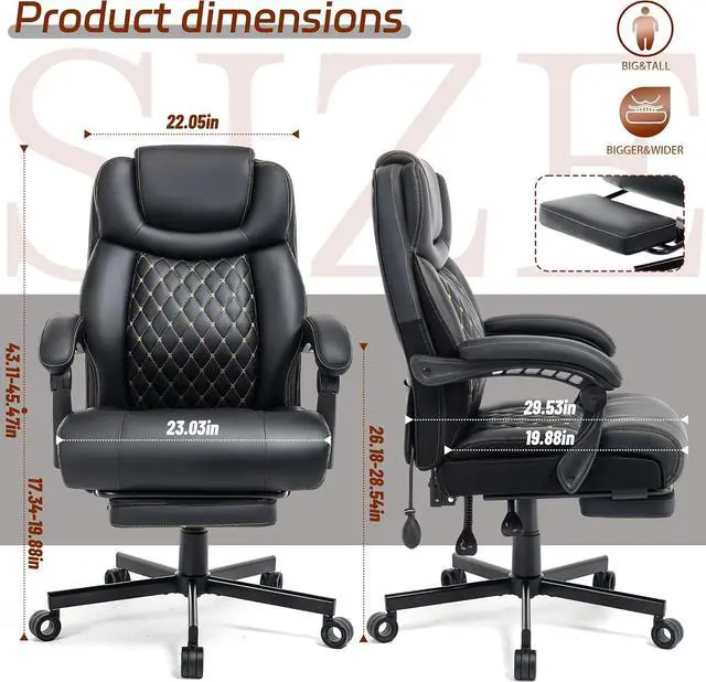 Office Chair, Big and Tall Recling Executive Chairs with Lumbar Support for Back Pain, Breathable Desk Computer Chair with Adjustable Footrest, Wide Cushion Swivel Home Office Chair Black PU