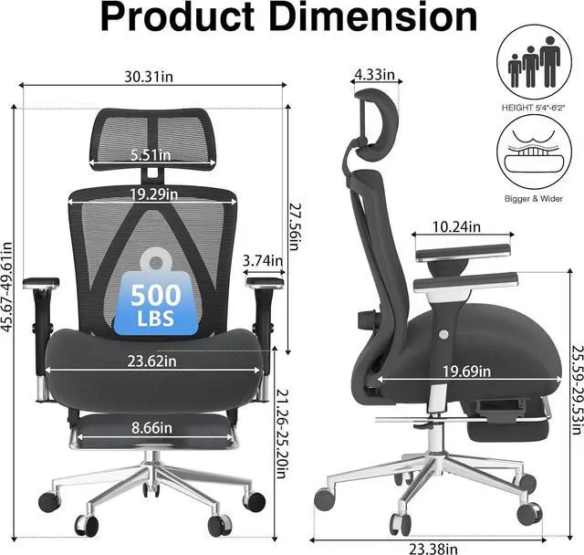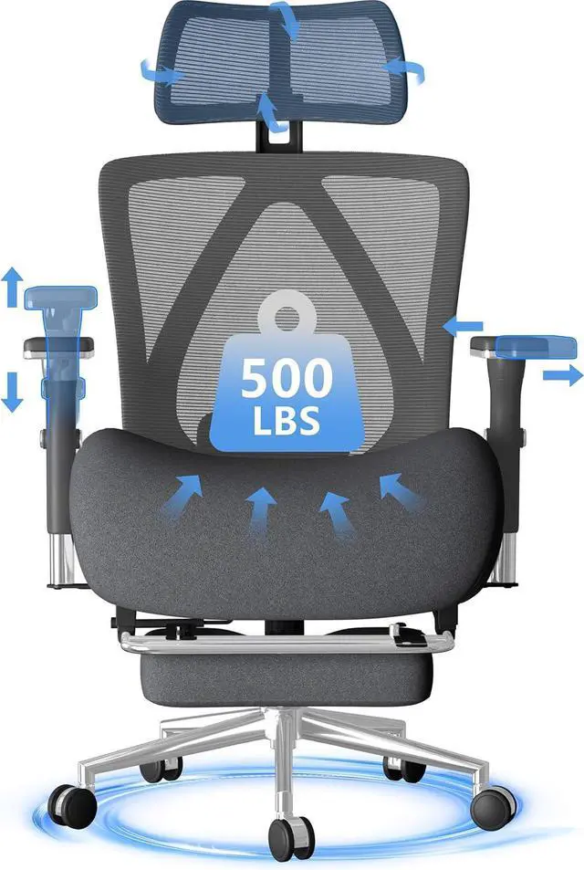 500 LBS Big and Tall Office Chair with Footrest, Ergonomic Mesh Office Chair with Thicken Wide Cushion, 4D Armrest, Adjustable Lumbar Support & Headrest, High Back Computer Desk Chair for Home, Gray