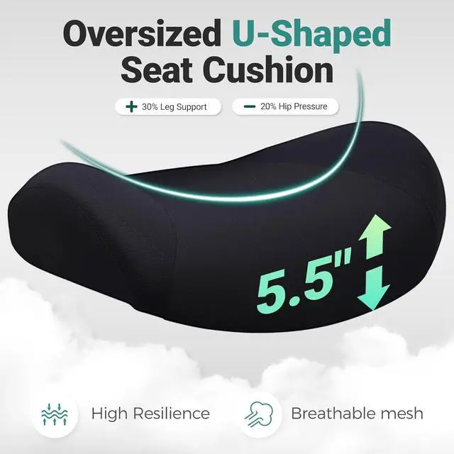 EXTRA WIDE & 5.5" THICK CUSHION ALL-DAY COMFORT Experience superior comfort with an extra-wide U-shaped seat cushion (22.5 wide) and 5.5-inch thick high-resilience foam that evenly distributes pressure and reduces fatigue. This wide desk chair is perfect for long hours of office work, remote jobs, studying, and computer use, offering plush support that holds its shape over time