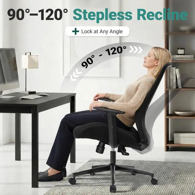 STEPLESS RECLINE & LOCK ADJUSTABLE FOR WORK OR RELAXATION The backrest offers a 90°120° stepless recline, allowing you to lock the chair securely at any angle you choose, rather than fixed preset positions. Whether youre focused on desk work, attending virtual meetings, or leaning back during breaks, this ergonomic office chair with lockable recline adapts smoothly to your posture throughout the day