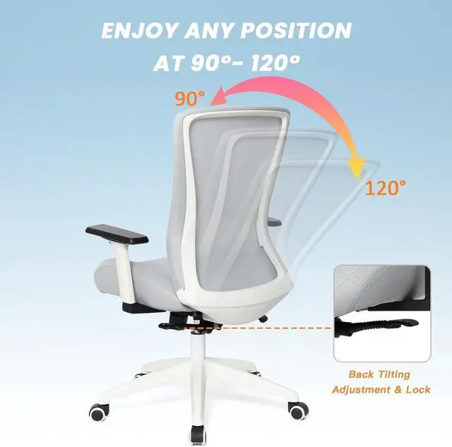 STEPLESS RECLINE & LOCK ADJUSTABLE FOR WORK OR RELAXATION The backrest offers a 90°120° stepless recline, allowing you to lock the chair securely at any angle you choose, rather than fixed preset positions. Whether youre focused on desk work, attending virtual meetings, or leaning back during breaks, this ergonomic office chair with lockable recline adapts smoothly to your posture throughout the day