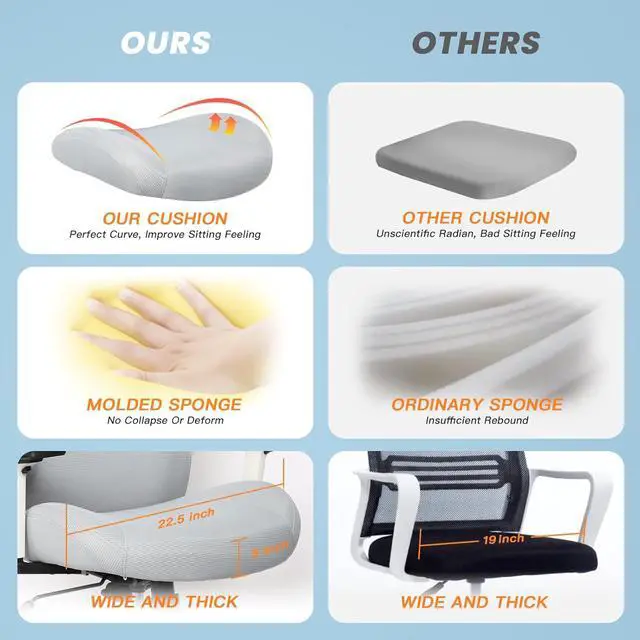 EXTRA WIDE & 5.5" THICK CUSHION ALL-DAY COMFORT Experience superior comfort with an extra-wide U-shaped seat cushion (22.5 wide) and 5.5-inch thick high-resilience foam that evenly distributes pressure and reduces fatigue. This wide desk chair is perfect for long hours of office work, remote jobs, studying, and computer use, offering plush support that holds its shape over time