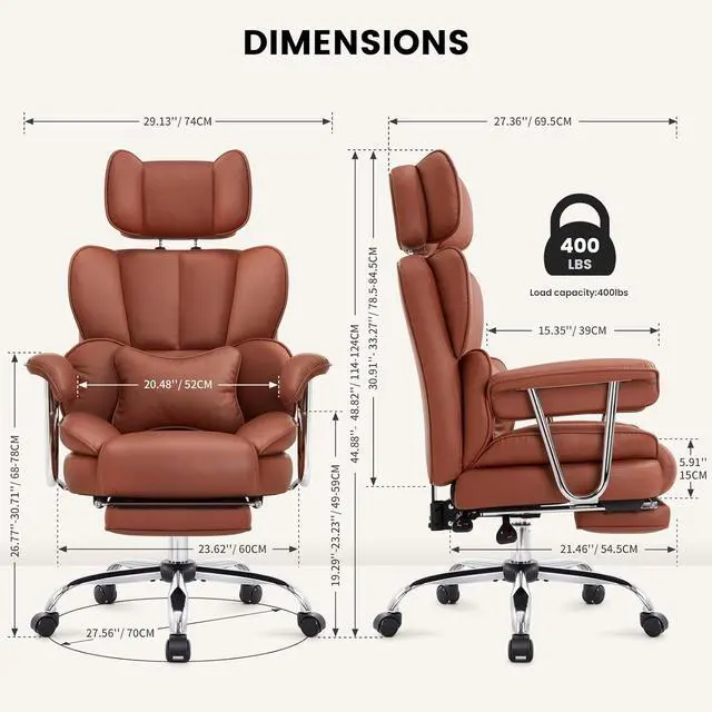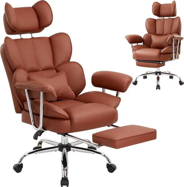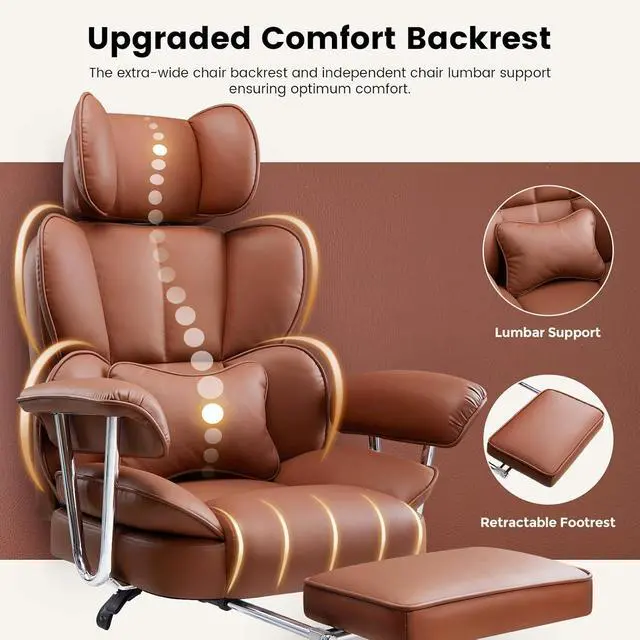 Big and Tall Executive Office Chair, Ergonomic High Back PU Leather Desk Chair, Heavy Duty Managerial Computer Chairs with Footrest, Adjustable Headrest, Armrests,Lumbar Support,400LBS(Brown)