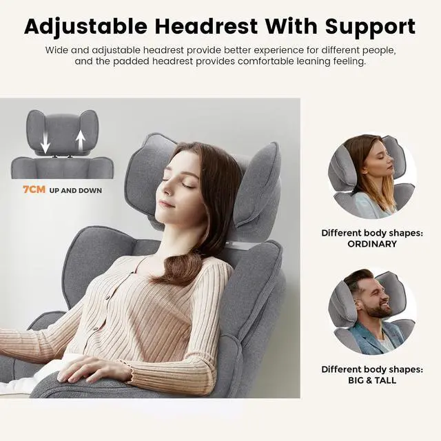 Ergonomic Office Chair: This desk chair is specially designed with a focus on ergonomics. High back and lumbar support can perfectly fit the back and neck. The backrest is filled with double-layer elastic sponge, gently wrapping around the body. Adjustable headrest helps alleviate neck pressure, effectively protecting your cervical spine, provide a more comfortable experience, promoting a healthy sitting posture