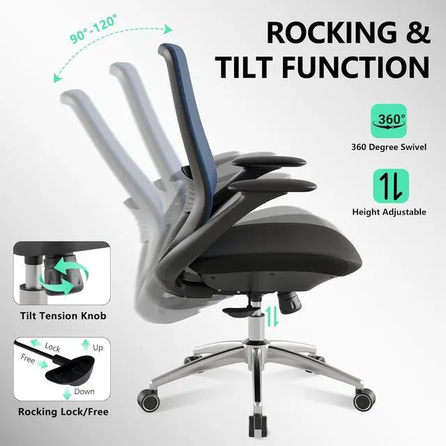 Ergonomic Office Chair, High Back Mesh Desk Chair with Lumbar Support, 360° Swivel & Slide-Adjustable Arms, Tilt Lock and Recline, Breathable Task Chair for Home Office & Gaming (Blue)
