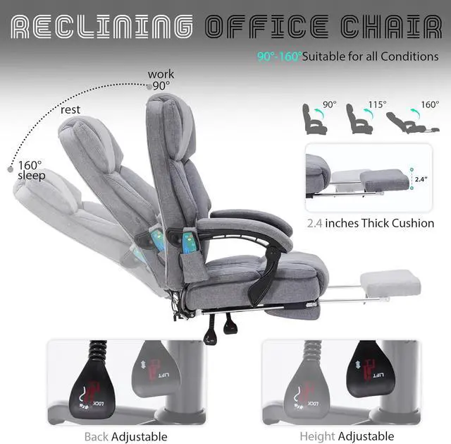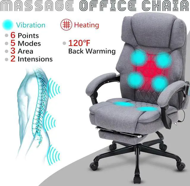 [MASSAGE AND HEAT] This massage office chair has a 6-point massage system offering 5 massage modes across 3 targeted areas (back,lumbar,seat) and 2 intensity levels. High frequency vibrations penetrate into your deep muscles, relieve fatigue. Also Enjoy the comforting warmth of the back heating function, maintaining a cozy 120°F