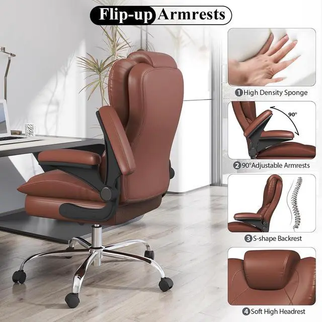 Office Desk Chair, Executive Leather Office Chair, High Back Ergonomic Home Desk Chair with Padded Flip-up Arms, Big and Tall Computer Chair with Rocking Function, 360°Swivel Free, Light Brown