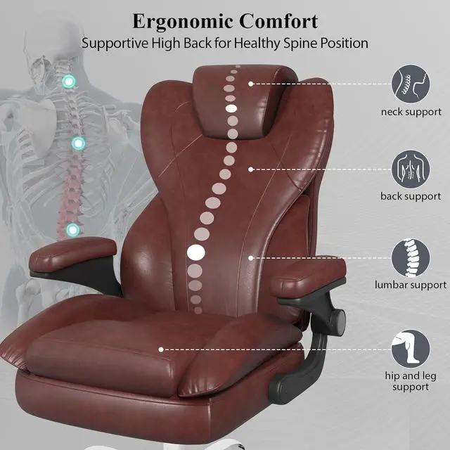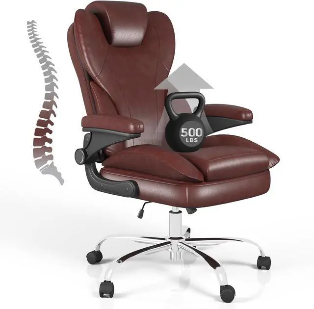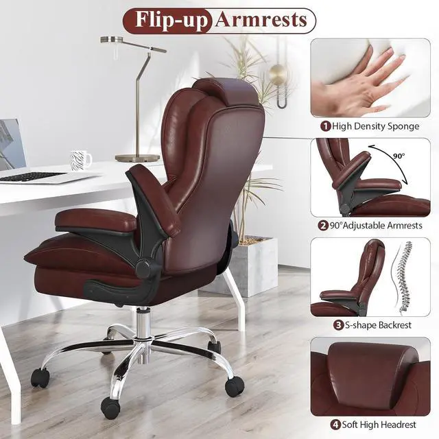 Office Desk Chair, Executive Leather Office Chair, High Back Ergonomic Home Desk Chair with Padded Flip-up Arms, Big and Tall Computer Chair with Rocking Function, 360°Swivel Free, Brown