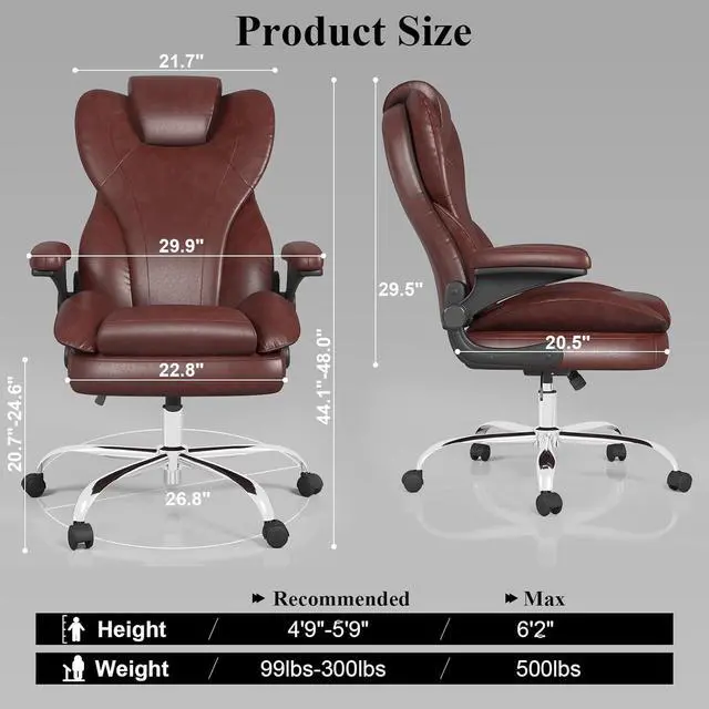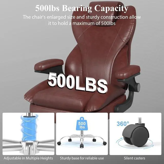 Durable and Stable ConstructionThis leather office chair offers excellent stability and long-lasting performance, with silent PU casters to protect floors. Equipped with a solid five-star metal base certified by BIFMA, the SGS-certified level 3 pneumatic lift has been rigorously tested to support up to 500 pounds. Its memory foam cushion frame is made of FSC-certified wood. This ensures that the frame and components will last through daily use. Making it ideal for everyday use in your home or office environment